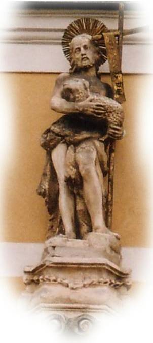 In den Seitenteilen der Fassade je eine Nische mit den die Eltern Johannes des Täufers darstellenden Sandsteinplastiken.