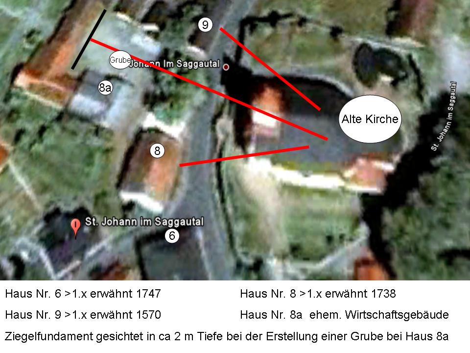 Das Fundament für die neue Kirche wurde an den bestehenden Häusern (siehe Bild) über den gesamten Hofbereich, unter der Straße bis hin zum Kirchen-Neubau errichtet. Die Kirchenummauerung mit den beiden Stiegenaufgängen und dem runden Kirchenvorplatz wurde 1855 errichtet. Der Standort der alten Kirche ist im Bild markiert. Das ehemalige Straßensteilstück zwischen den Häusern Nr. 6, 8, 9 und der Kirchenummauerung wurde in den Jahren um 1950 aufgefüllt und dadurch leichter befahrbar gemacht, das offene Wassergerinne südlich der Kirche wurde kanalisiert.