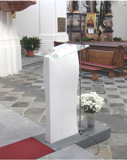 Die neue Altarzunge als Einbau in den Bestand vertuscht nicht, sondern vermittelt, dass das Ambo in seiner dauernden Bedeutung zwischen zeitlich bedingten Ordnung (Barock bis 21. Jhdt.) steht. Seine Form selbst greift das Motiv von Festigkeit und Verwandlung auf. Nach seiner Taufe durch Johannes verwandelt Christus die herkömmliche Nutzung des Wassers, indem sein Gang über das Wasser die Ängstlichkeit des Menschen überwindet. Die „Frohbotschaft“ wird von einer schlanken, lichten, durch eine Glasplatte abgeschlossenen Form verkündet.