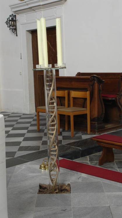 Seine spiralig gewundene Form greift das Wellenmotiv von Altar und Ambo auf, verweist auf die gedrehten Säulen im Tabernakelaufsatz.