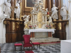 Die feierliche Mitte ist der Altar - wie das Ambo aus hellem Stein - welche die vorhandenen Elemente steigern, die triumphierende Helligkeit des Hochaltarabschlusses aufgegriffen, und wirkt würdevoll und nicht starr.