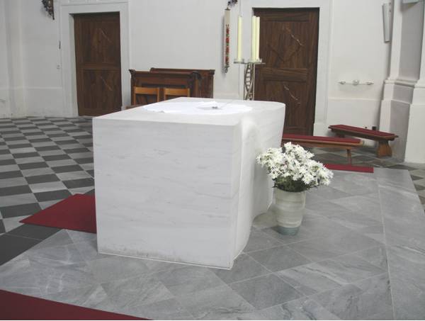Altar, Ambo und Leuchter bilden durch Materialwahl und Farbe ein lichtes Zentrum, sammeln und abstrahlen die Energie.