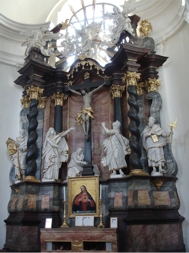 Der den gleichen architektonischen Aufbau wie der ihm gegenüberliegenden Marienaltar besitzende Kreuzaltar wurde auch zur selben Zeit vom selben Bildhauer verfertigt. Die Darstellung des Gekreuzigten wird links von der Muttergottes, der als sichtbarer Hinweis auf ihren Schmerz über den Tod des Sohnes ein Schwert das Herz durchbohrt und rechts vom hl. Johannes Evangelist flankiert; den Kreuzesstamm umfasst die kniende Büßerin Maria Magdalena.