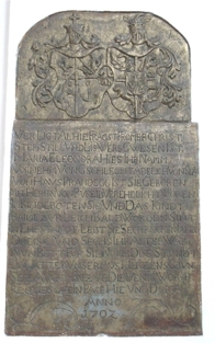Auf der rechten Seite der Grabstein der Maria Susanna Freiin von Siegersdorf, geborene Freiin von Welsersheim, die im Jahre 1701 verstorben ist mit folgender Inschrift: