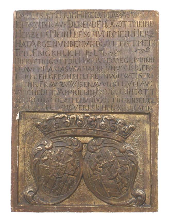"Dan Basl Ist Mir Im Himmel Und Was Wolte Ich Von Dir Auf Der Erden. O, Gott Meines Herzens. Mein Fleisch Und Mein Herz Hat Abgenumben Und Gott Ist Mein Teil Ebigklich. Psl. mo72so. Hier Ruet In Gott Die Hoch Und Boe Gepohrne Frau FR: Maria Susana Freijin Von Sigerheimb. Frau Zu Wisenau Und Thunau: Welche Den 11 Aprill In 1701 Jahr In Gott Selig Entschlaffen Und Gott Selige Auferstehung Verleichen Wolle Amen".